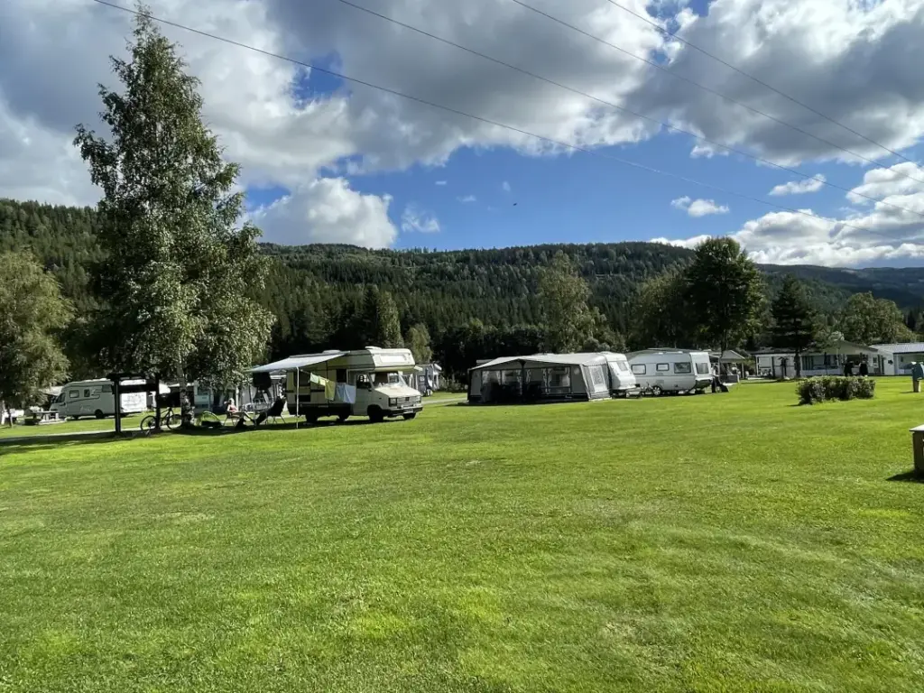 Lett å finne, lett å trives: Beliggenheten langs Rv 51 gir enkel adkomst, mens elvekanten og grøntarealene gir den rolige stemningen mange søker på camping.